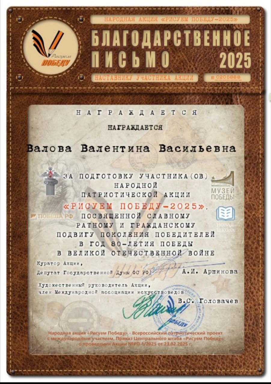 Поздравляем Некрасову Катю - учащуюся изостудии "Радуга" (руководитель Валова Валентина Васильевна), награжденную дипломом за активное участие в народной патриотической акции "РИСУЕМ ПОБЕДУ - 2025", посвящённой славному ратному и гражданскому подвигу поколения победителей в год 80-летия Победы в Великой Отечественной войне.