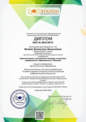 29 сентября 2025 года руководитель изостудии "Радуга" Валова Валентина Васильевна принимала участие во Всероссийской педагогической конференции "Перспективные технологии и методы в практике современного образования (г. Москва)", организованной Федеральным инновационным центром образования "Эталон".