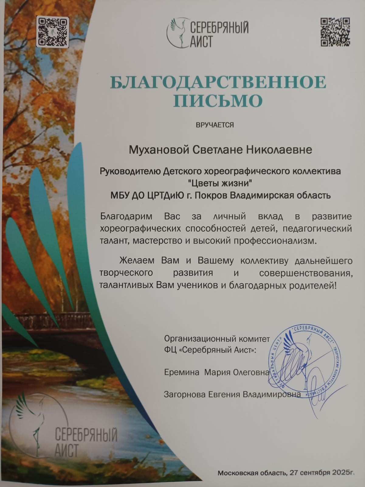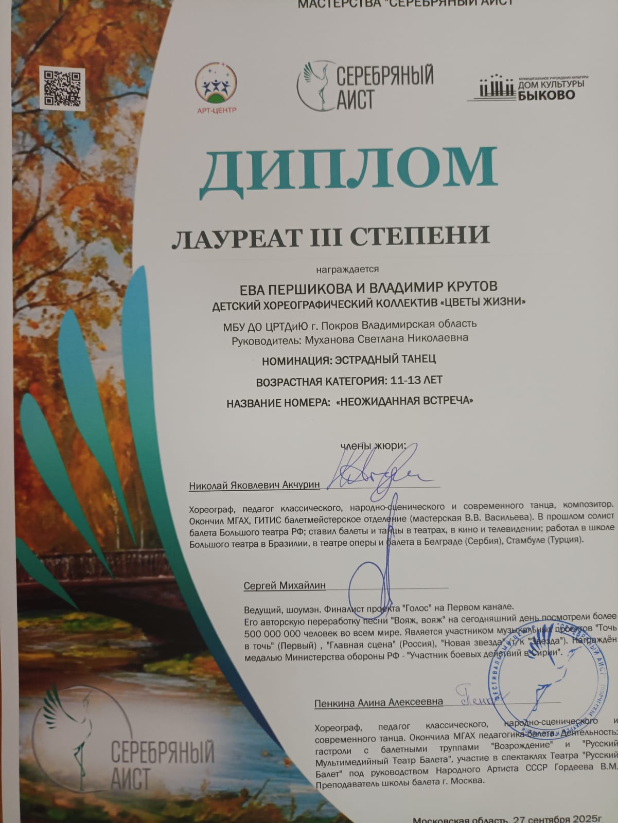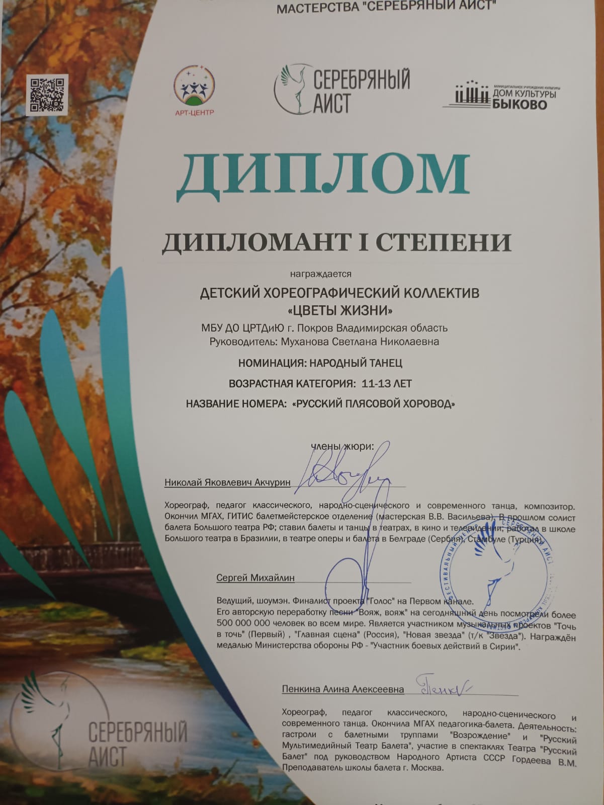 Участники Детского хореографического коллектива "Цветы жизни" (руководитель Светлана Николаевна Муханова) приняли участие во Xlll Всероссийском конкурсе искусств " Серебряный Аист"(г.Подольск). В этот день было много волнений ... Дети исполнили : Русский плясовой хоровод (ансамбль) Неожиданная встреча дуэт) Поздравляем танцоров с участием и победой в конкурсе!