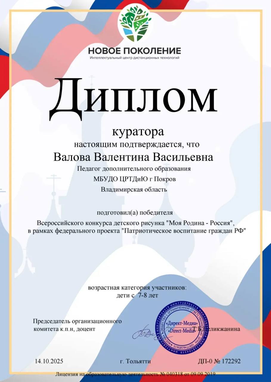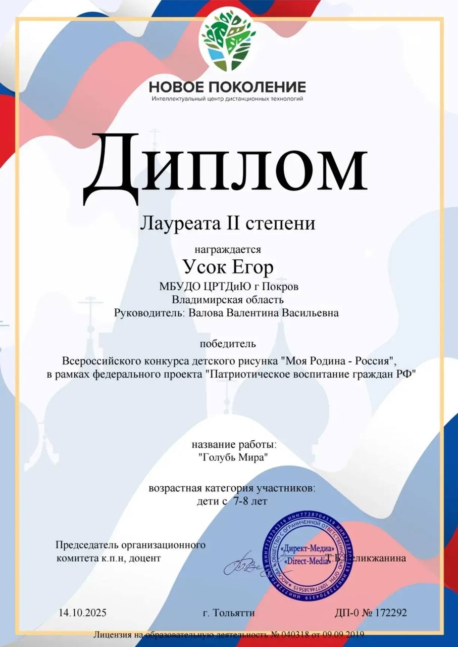 Поздравляем Усок Егора, обучающегося изостудии "Акварелька" (руководитель Валова Валентина Васильевна) с победой во Всероссийском конкурсе детского рисунка "Моя Родина - Россия" в рамках федерального проекта "Патриотическое воспитание граждан РФ".