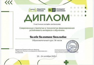 В октябре 2025 года руководитель изостудии "Радуга" Валова Валентина Васильевна проходила курсы повышения квалификации "Современные стратегии и технологии формирования устойчивого интереса к обучению", 36 часов.