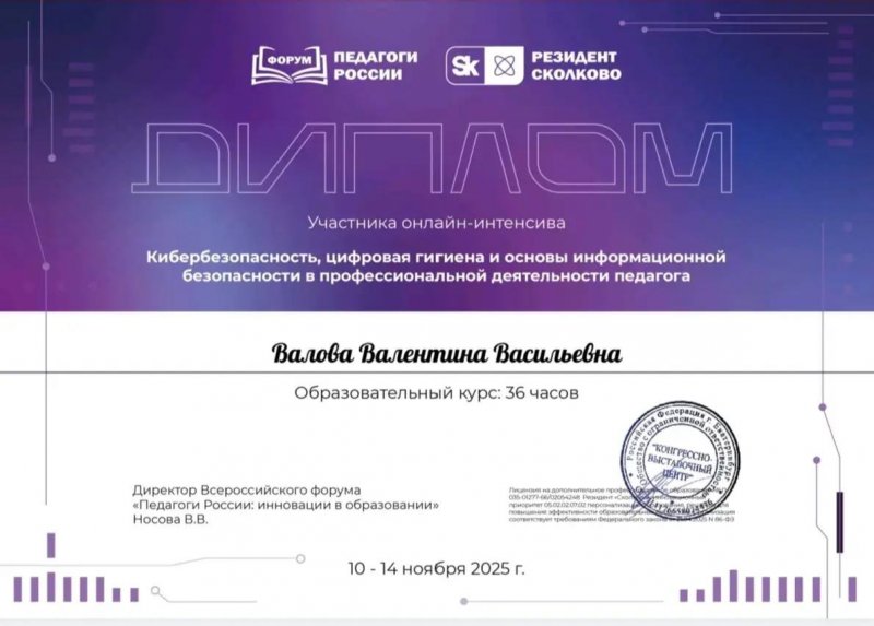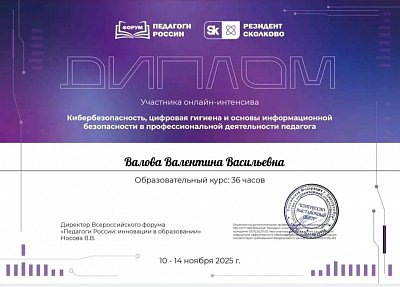 В ноябре 2025 года руководитель изостудии "Радуга" Валова Валентина Васильевна проходила курсы повышения квалификации "Кибербезопасность, цифровая гигиена и основы информационной безопасности в профессиональной деятельности педагога", 36 часов.