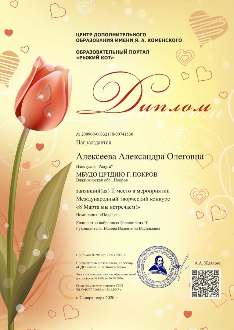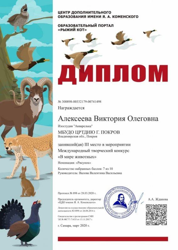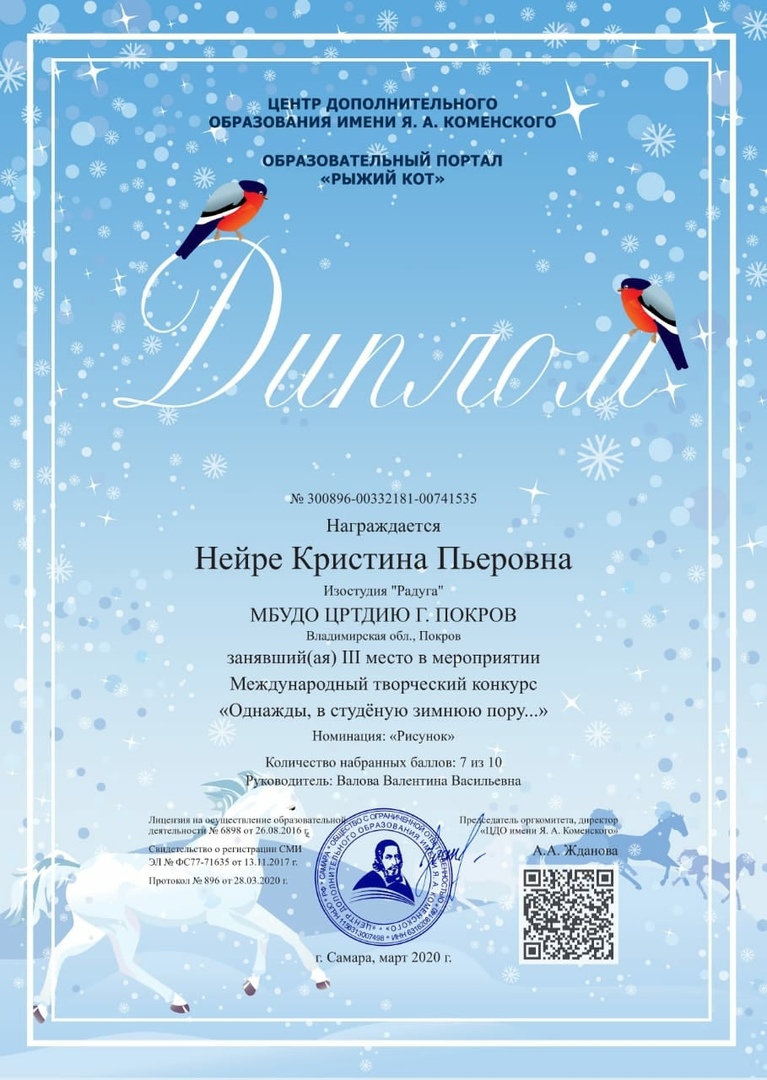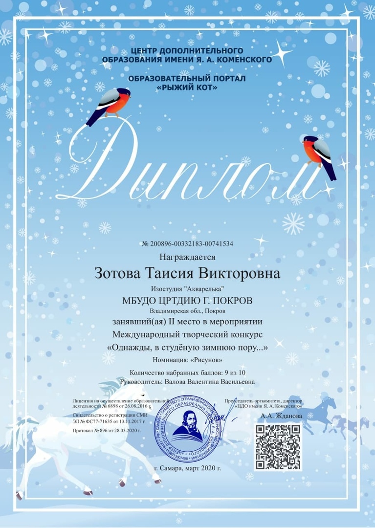 Поздравляем обучающихся изостудии "Радуга" и "Акварелька" (руководитель Валова В. В.), которые победили в дистанционных Международных творческих конкурсах: "8 Марта мы встречаем!", "В мире животных", "Однажды, в студёную зимнюю пору..."