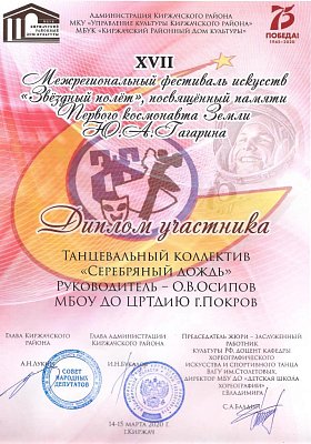 14 марта 2020 года. Участники коллектива «Серебряный дождь» под руководством Осипова Олега Владимировича приняли участие в межрегиональном фестивале - конкурсе "Звездный полет" организованным МКУ «Управлением Культуры Киржачского района» г . Киржач, в хореографической номинации- эстрадный танец, смешанный состав. Также в конкурсе участвовали коллективы из таких городов как: Юрьев-Польский, Владимир, Киржач, Гусь-Хрустальный, Кольчугино, Александров, Карабаново, пос. Следневский. Более 200 участников ,разнообразие как хореографических (преимущественно народных) , так и вокальных и инструментальных коллективов. По итогу диплом участник