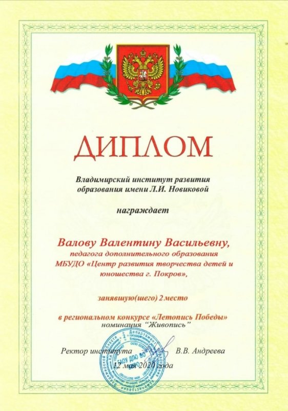 В мае 2020 года Владимирский институт развития образования имени Л. И. Новиковой проводил региональный конкурс "Летопись Победы", в котором принимала участие руководитель изостудии "Радуга" Валова Валентина Васильевна. Она завоевала 2 место в номинации "Живопись" среди педагогов.