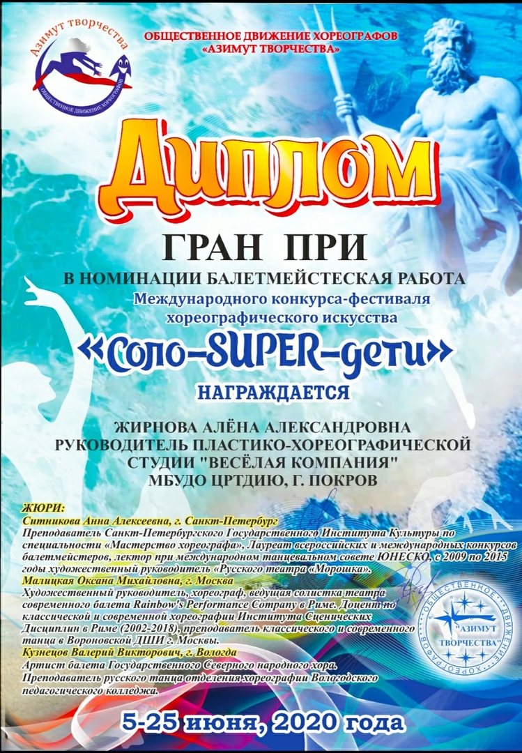 В Международном конкурсе-фестивале хореографического искусства "Соло- SUPER- дети" вместе со своими воспитанниками приняла участие и руководитель Пластико-хореографической студии "Весëлая компания"- Алëна Александровна Жирнова!