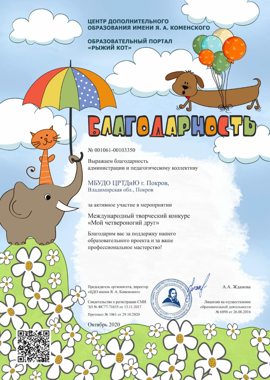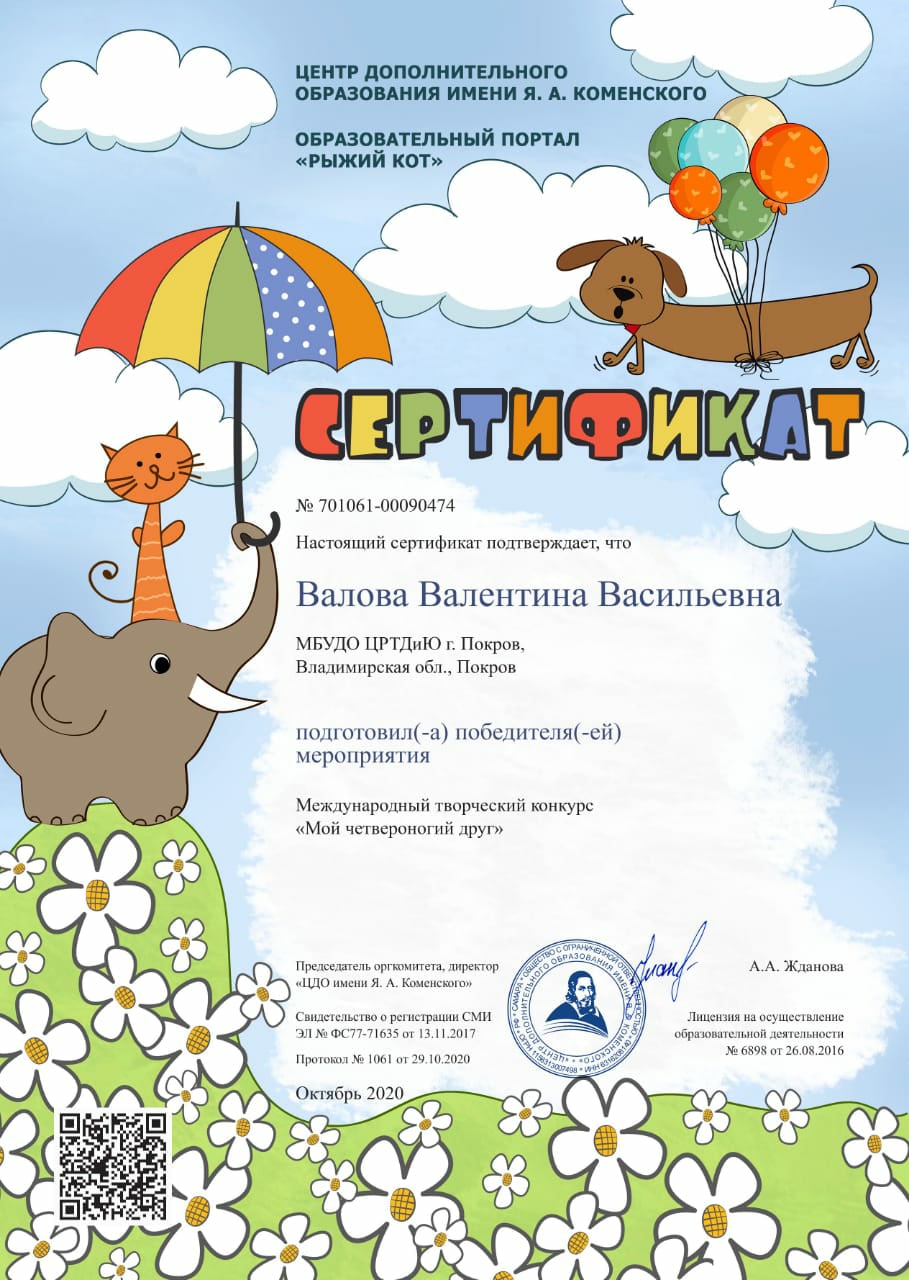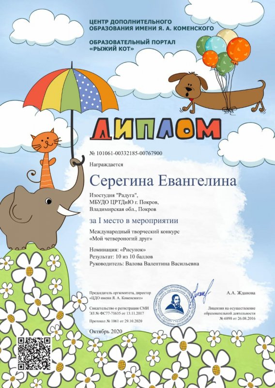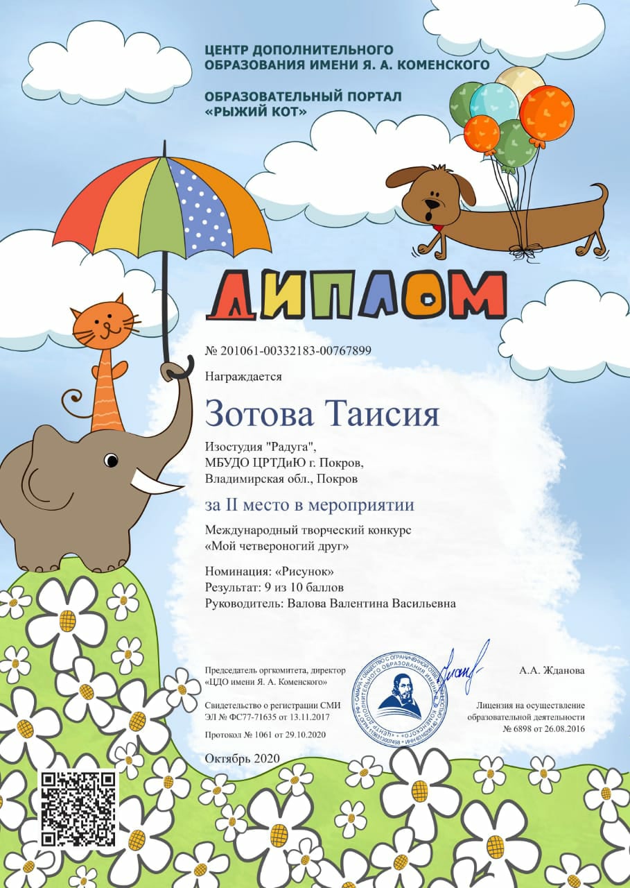 В октябре 2020 года обучающиеся изостудии "Радуга" (руководитель Валова Валентина Васильевна) принимали участие в дистанционном Международном творческом конкурсе. Поздравляем Серёгину Еву и Зотову Таю - победителей Международного творческого конкурса "Мой четвероногий друг" и Бондарь Ариадну, победившую в Международном творческом конкурсе "Есть в осени первоначальной..." Ура!!! Молодцы!!!