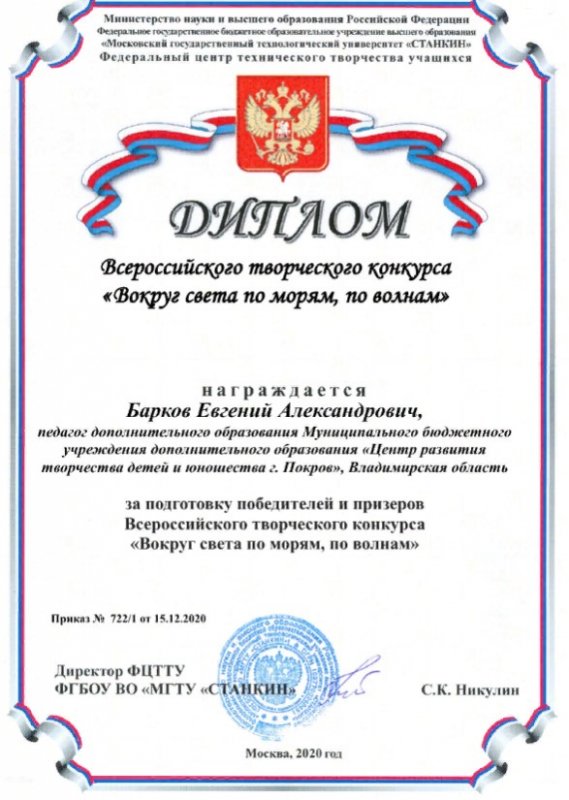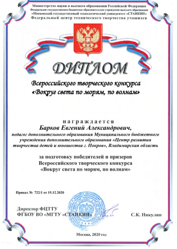 Стали известны результаты Всероссийского творческого конкурса "Вокруг света по морям, по волнам" и наша студия Судомоделирования под руководством Баркова Е.А. заняла почетные дипломы!