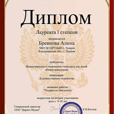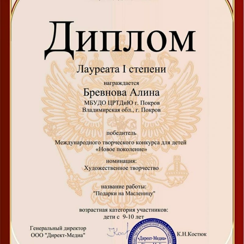В марте 2021 года обучающиеся изостудии "Радуга" (руководитель Валова Валентина Васильевна) принимали участие в Международном творческом конкурсе для детей "Новое поколение". Поздравляем победителей конкурса лауреатов 1 степени: Бобину Наташу- 1 место ????и Бревнову Алину - 1 место !!!