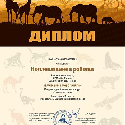 В марте 2021 года студия "Пластилиновая радуга" (руководитель Зайцева Мария Владимировна) принимали участие в Международном творческом конкурсе "В мире животных", получили почётные дипломы. Поздравляем ребят студии и педагога!