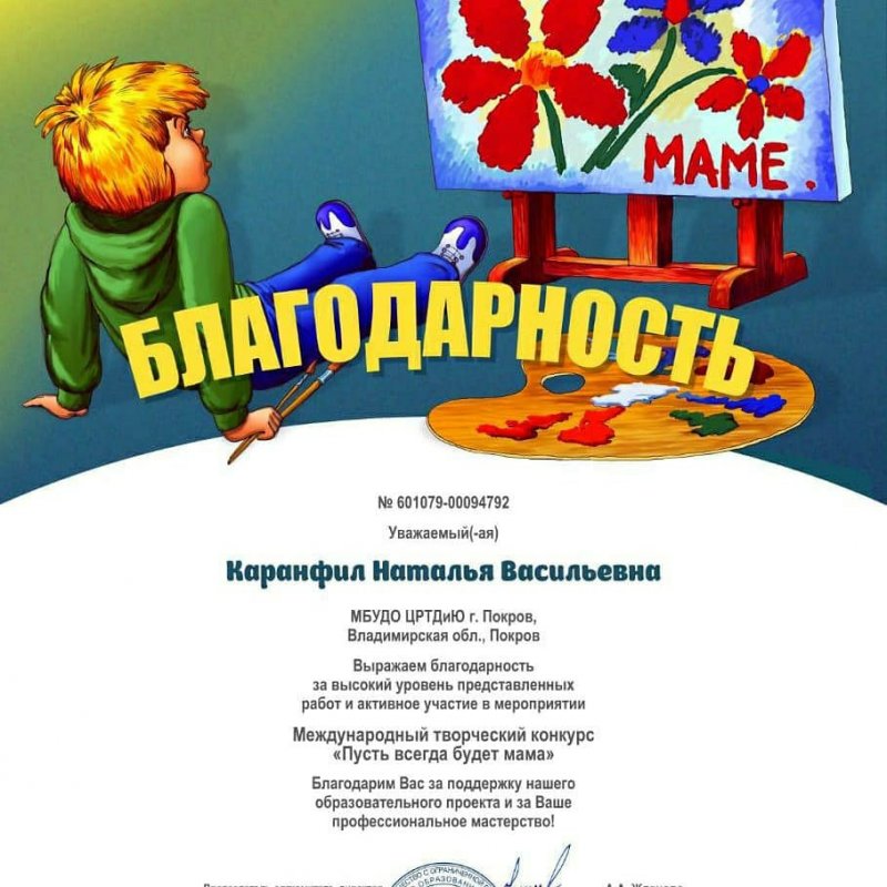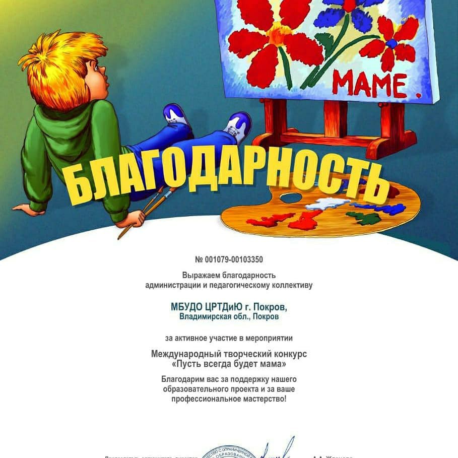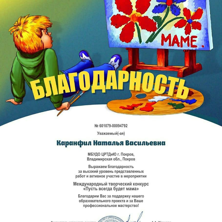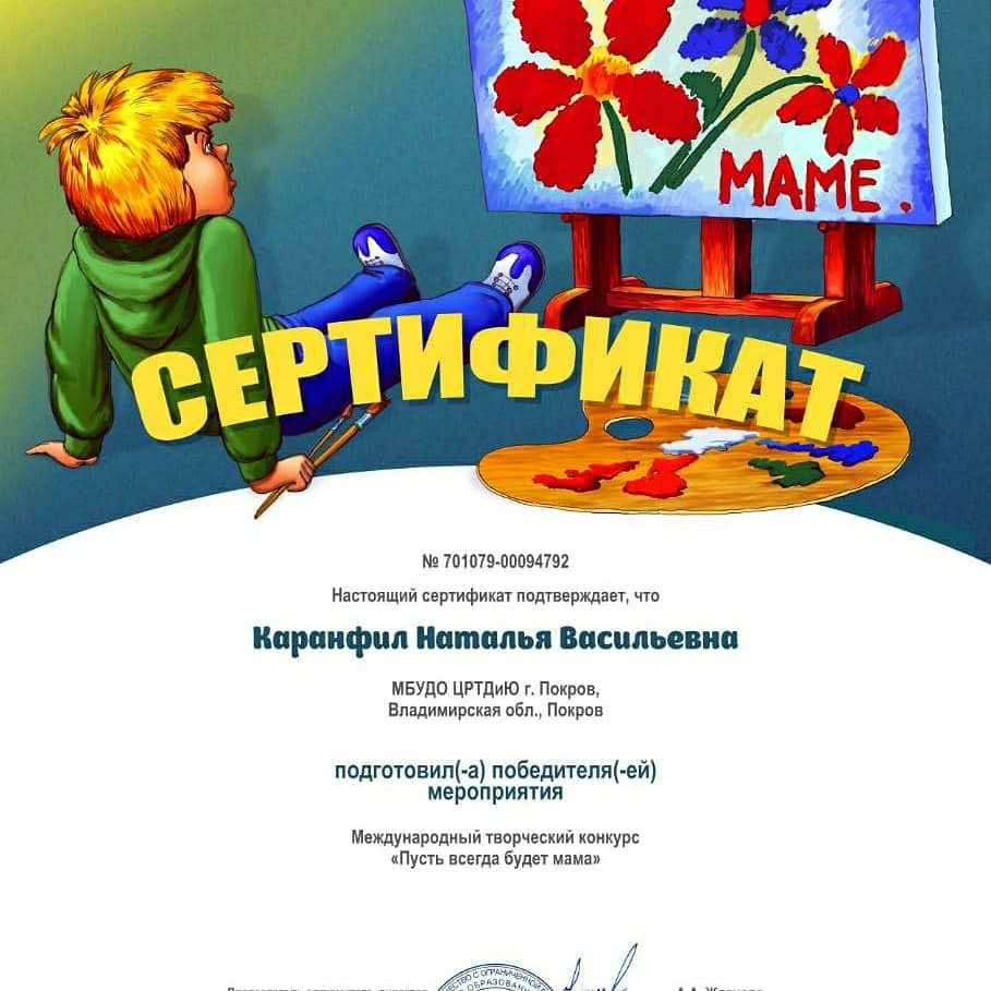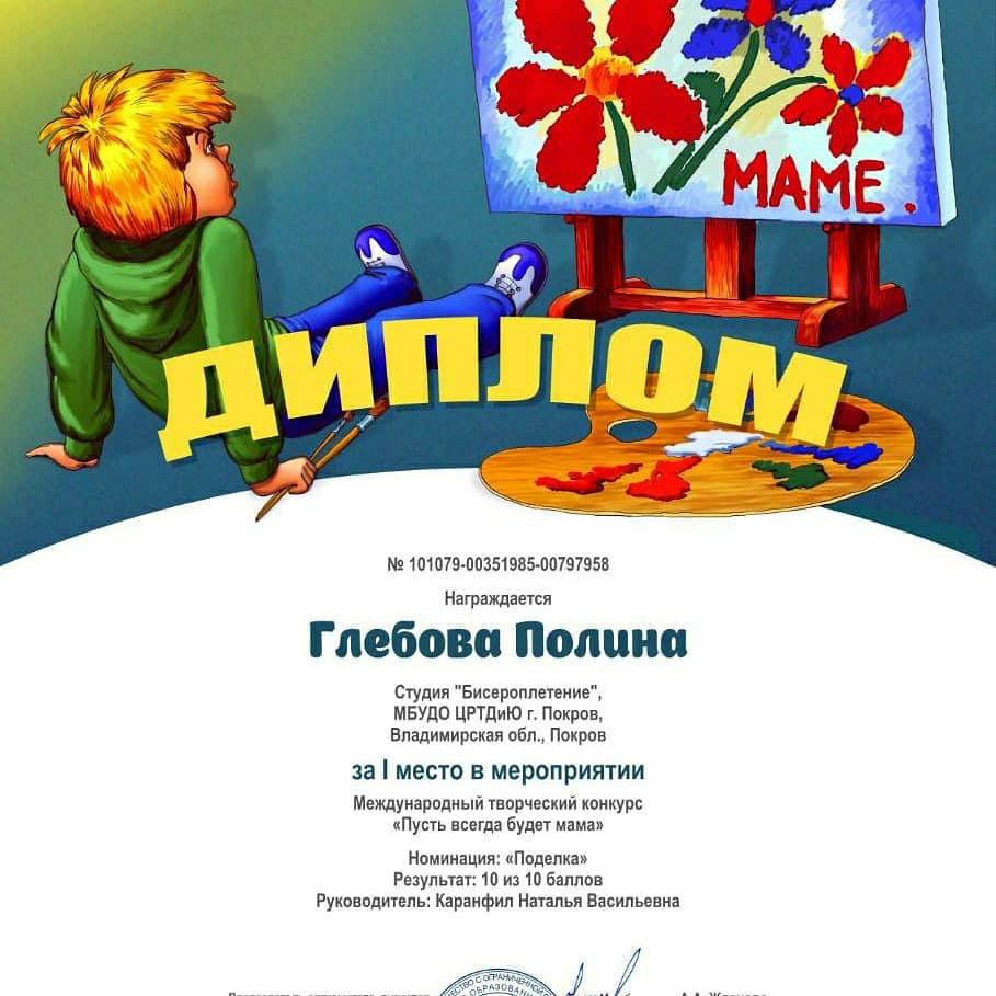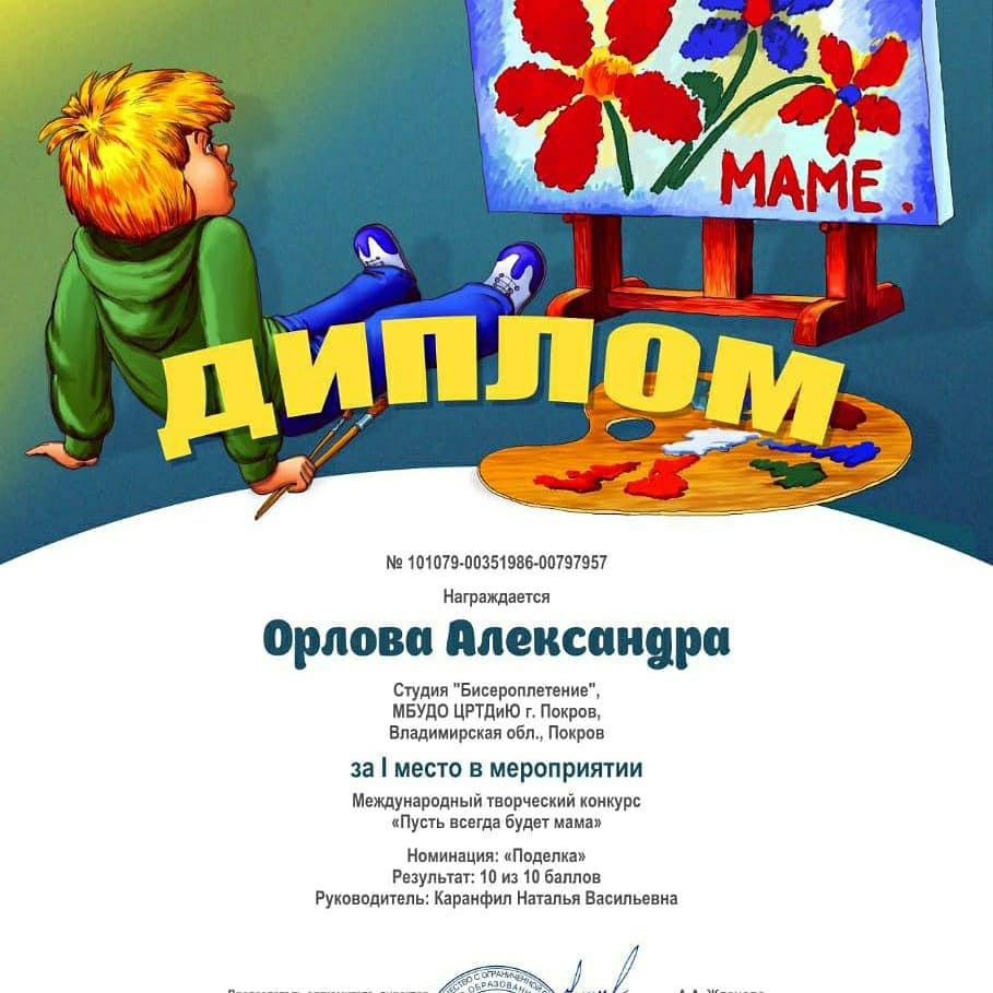 В марте 2021 г обучающиеся студии «Бисероплетение» (под руководством педагога дополнительно образования Каранфил Н.В.) Орлова Александра и Глебова Полина приняли участие в Международном творческом конкурсе «Пусть всегда будет мама»♥где заняли призовые (первые) места!!!Молодцы девочки!