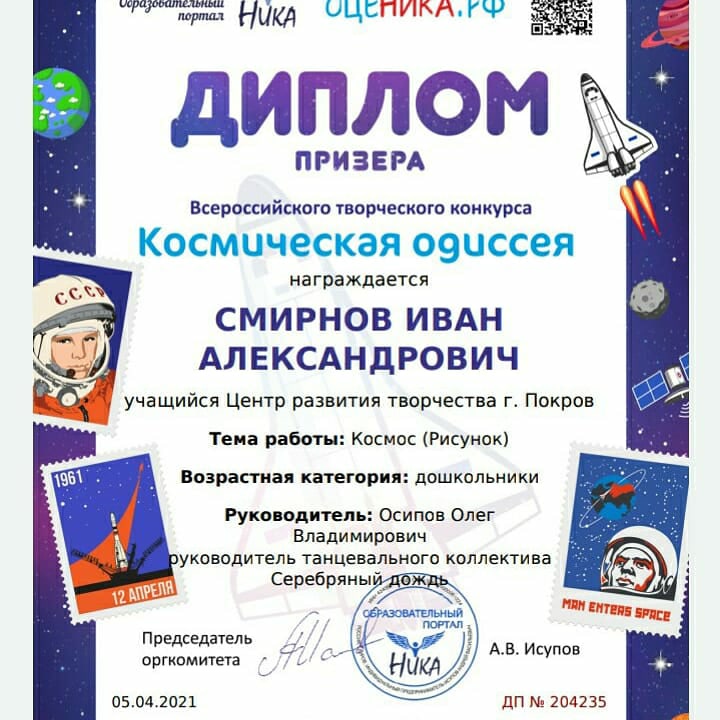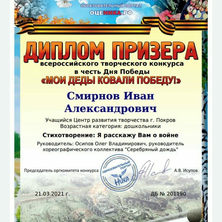В марте и апреле 2021 года Смирнов Иван, младшая группа хореографического коллектива " Серебряный дождь" ( руководитель Осипов О.В) принимал участие во всероссийском творческом конкурсе в честь дня победы " Мои деды ковали победу" и " Космическая Одиссея", и был награждён дипломами призёра.