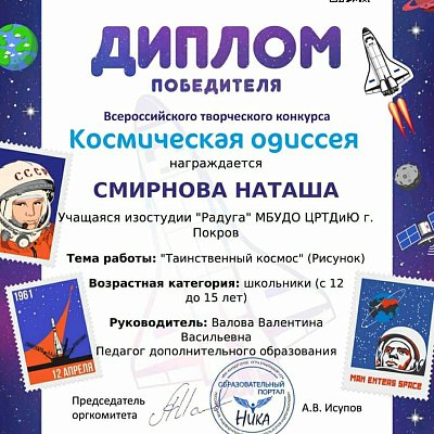 5 мая 2021 года обучающаяся изостудии "Радуга" (руководитель Валова Валентина Васильевна) принимала участие во Всероссийском творческом конкурсе "Космическая одиссея". Поздравляем победителя конкурса Смирнову Наташу !!!