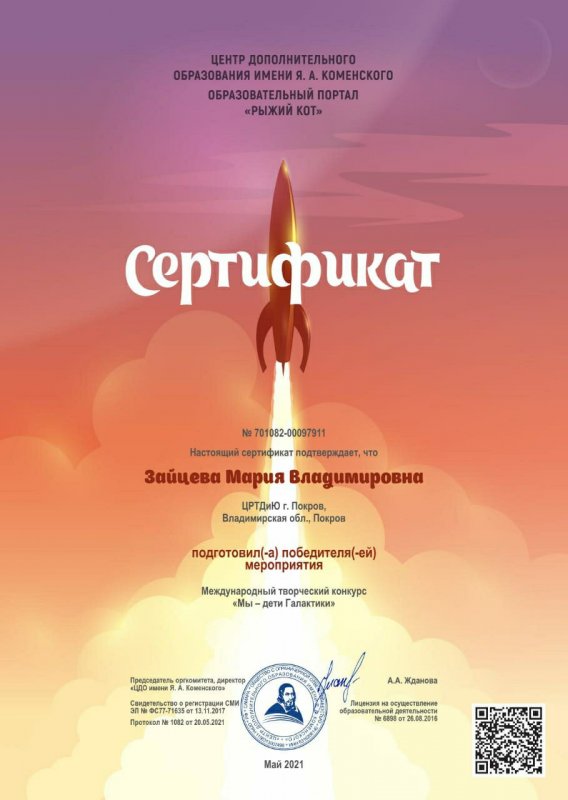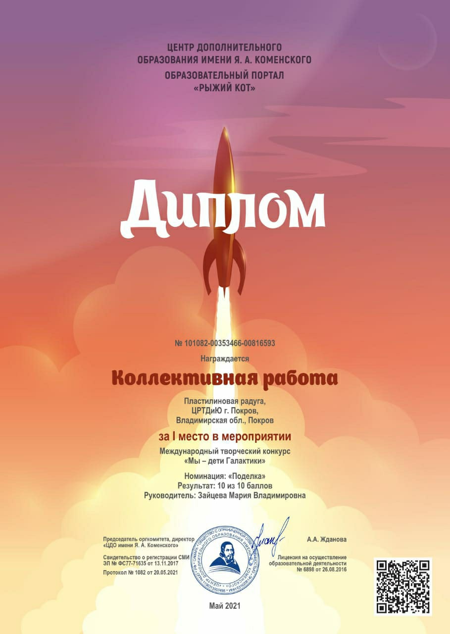 В мае 2021 года студия "Пластилиновая радуга" (руководитель Зайцева Мария Владимировна) принимали участие в Международном творческом конкурсе "Мы-дети Галактики", получили почётные дипломы за 1 место!!! Поздравляем ребят студии и педагога! Ребята молодцы!!!