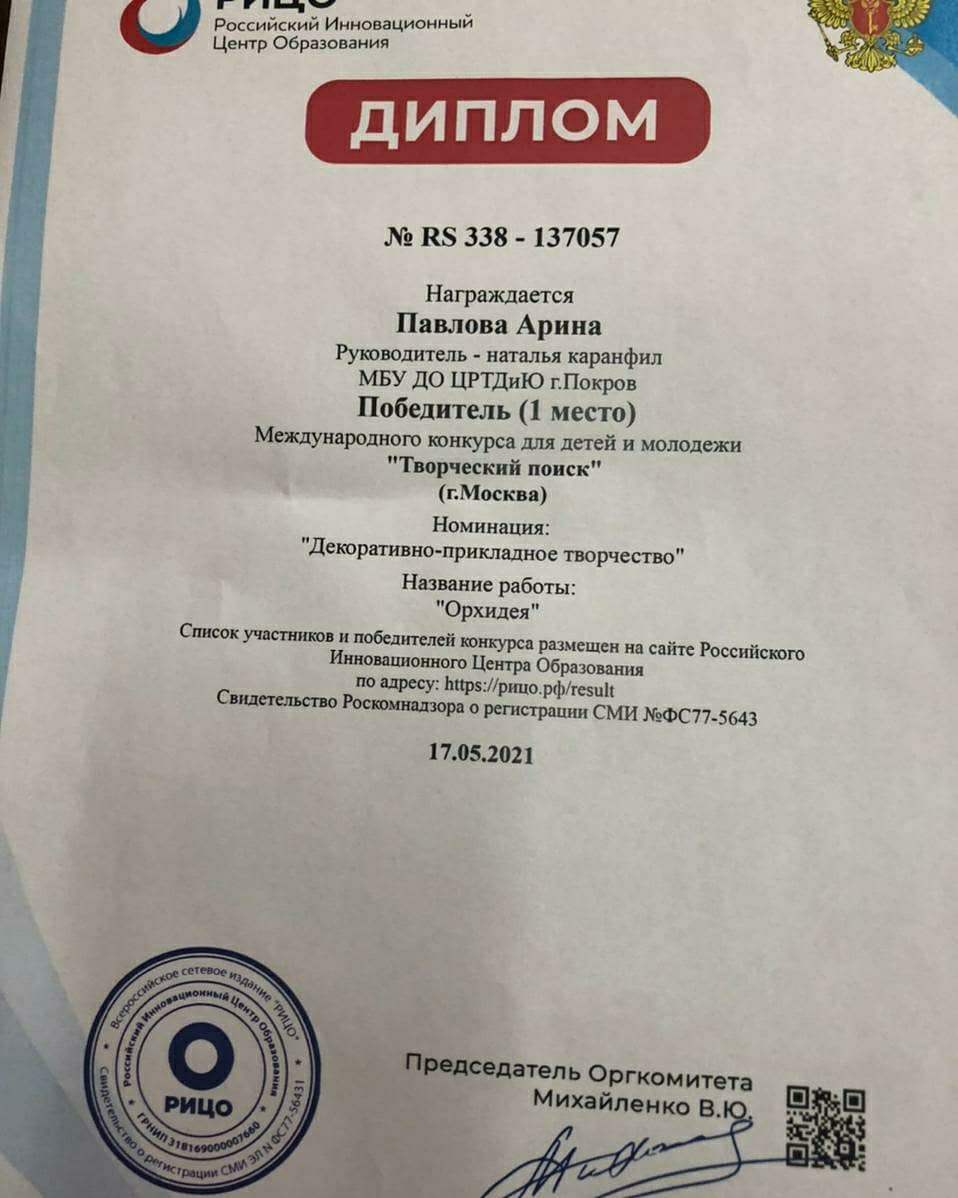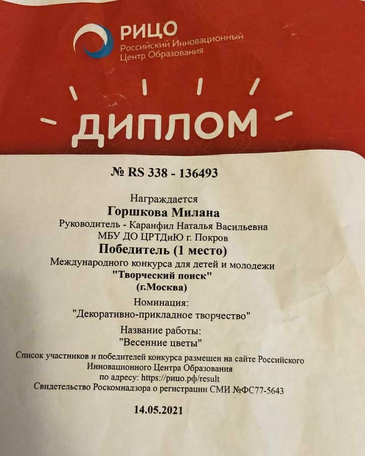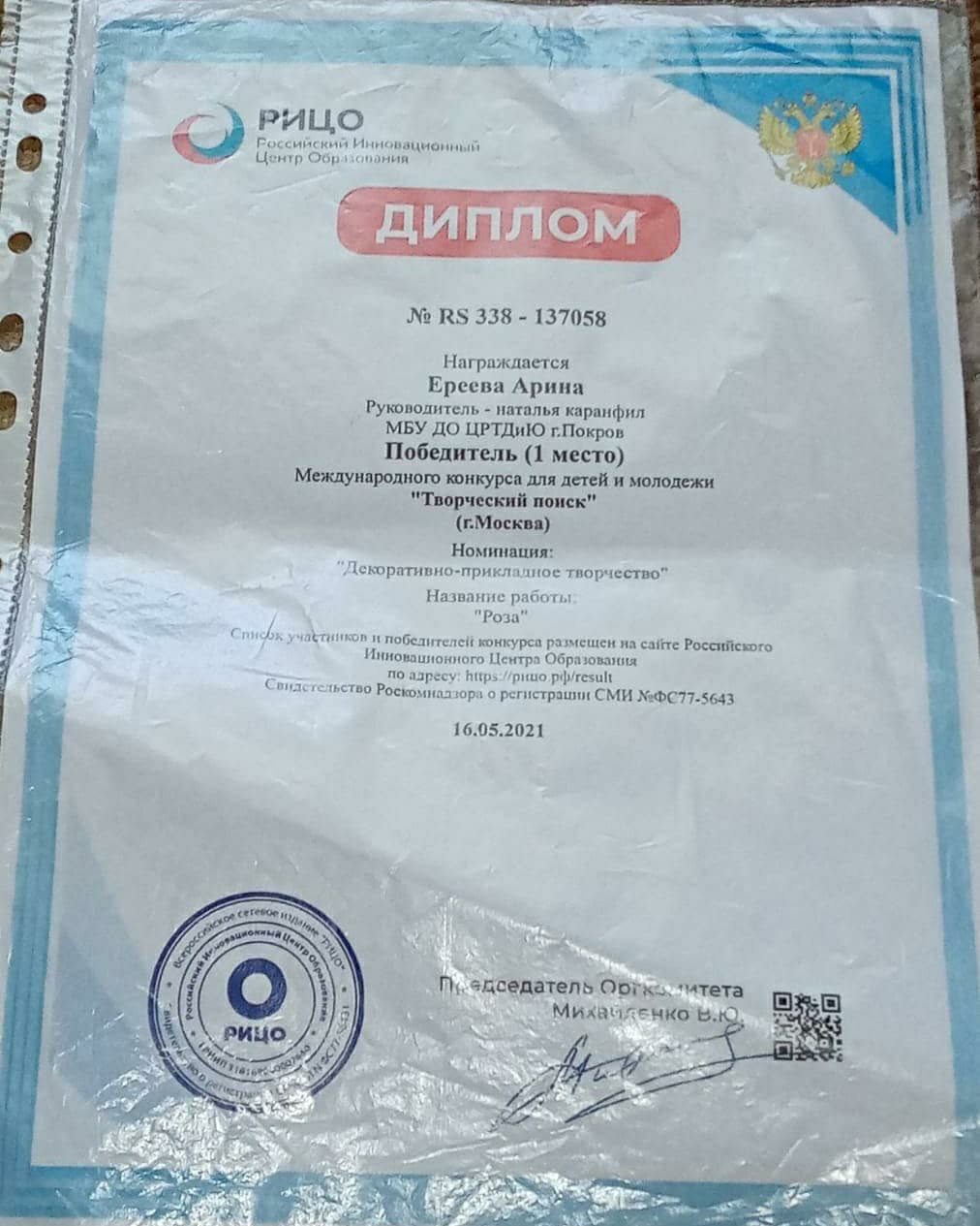 Дети из студии «Бисероплетение»( руководитель Каранфил Н.В) принимали активное участие в Международном конкурсе «Творческий поиск» г. Москва,где в различных номинациях заняли призовые места. Павлова Арина 1 место, Горшкова Милана 1место, Ереева Арина 1 место Поздравляем девочек с их заслуженной наградой!!!