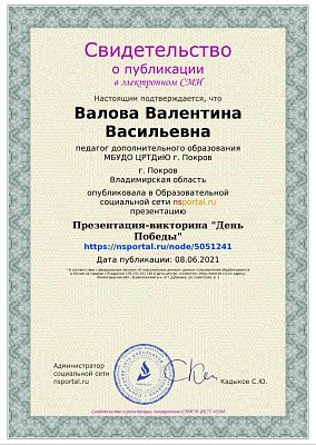 8 июня 2021 года руководитель изостудии "Радуга" Валова Валентина Васильевна опубликовала в Образовательной социальной сети nsportal.ru Презентацию-викторину "День Победы".