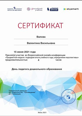 15 июня 2021 года руководитель изостудии "Радуга" Валова Валентина Васильевна принимала участие во Всероссийской онлайн-конференции "Предметная неделя: подводим итоги учебного года, определяем перспективы", организованной издательством Академия "Просвещение", "Бином", корпорацией "Российский учебник" и онлайн-школой "Skysmart" г. Москва. Тема трансляции: "День педагога дошкольного образования".