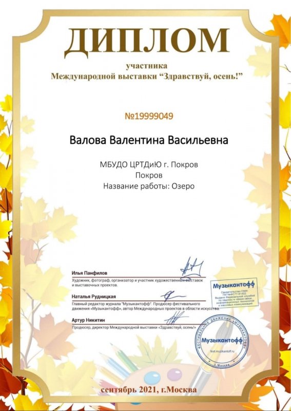 В сентябре 2021 года руководитель изостудии "Радуга" Валова Валентина Васильевна принимала участие в Международной выставке "Здравствуй, осень!" Организатор выставки: журнал "Музыкантофф", Фестивальное движение "Музыкантофф" г. Москва