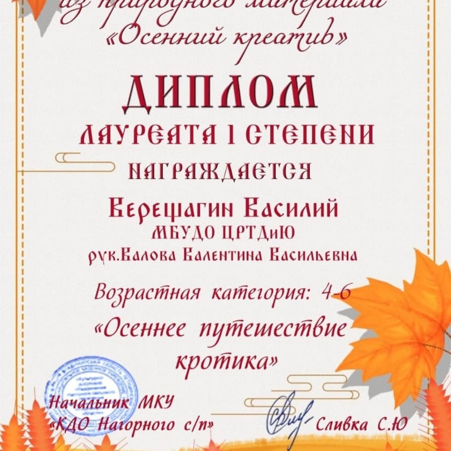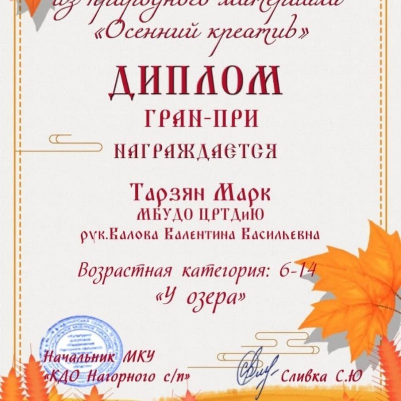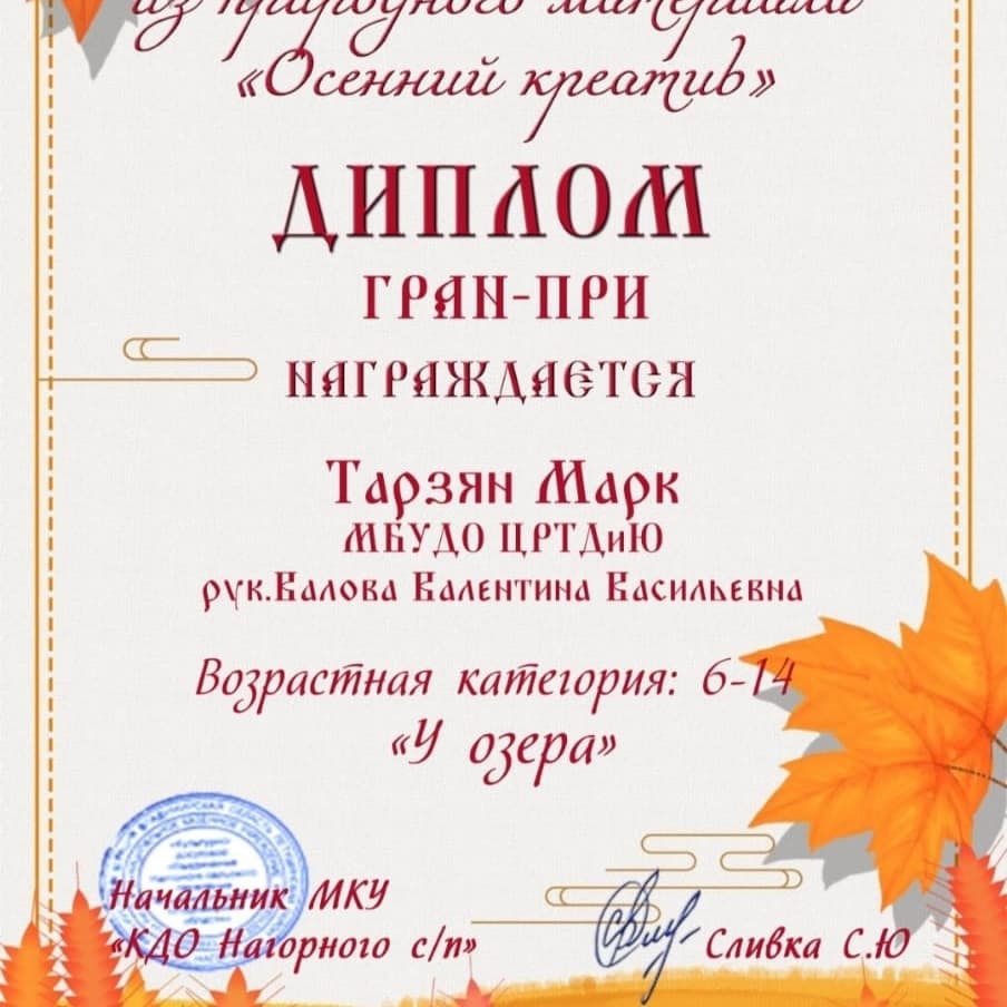 Поздравляем Тарзян Марка, завоевавшего Гран-При конкурса "Осенний креатив" в возрастной категории 6 - 14 лет!!! Ура!!!Молодец!!!