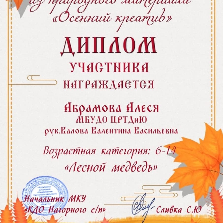 В сентябре 2021 года обучающиеся изостудии "Радуга" и "Акварелька" (руководитель Валова Валентина Васильевна) принимали участие в дистанционном творческом конкурсе "Осенний креатив", организованном МКУ "КДО Нагорного с/п".
