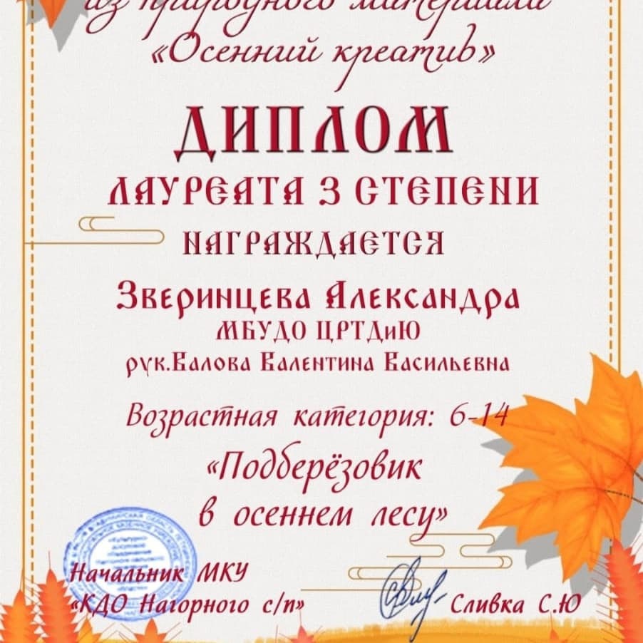 Поздравляем победителей конкурса "Осенний креатив" Лауреата 1 степени Верещагина Василия и Лауреата 3 степени Зверинцеву Александру!!!