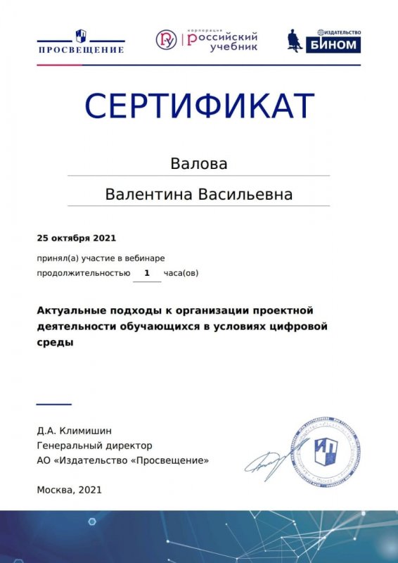 25 октября 2021 года руководитель изостудии "Радуга" Валова Валентина Васильевна принимала участие в вебинаре, организованном издательством Академия "Просвещение", "Бином" и корпорацией "Российский учебник" г. Москва. Тема вебинара: "Актуальные подходы к организации проектной деятельности обучающихся в условиях цифровой среды".