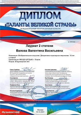10 декабря 2021 года руководитель изостудии "Радуга" Валова Валентина Васильевна принимала участие в Международном многожанровом конкурсе "Таланты великой страны" г. Москва, Фестивальное движение "Музыкантофф".