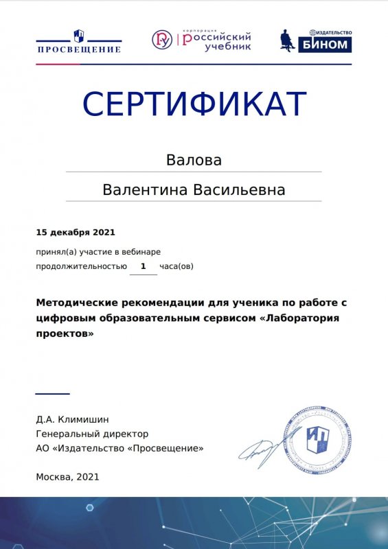 15 декабря 2021 года руководитель изостудии "Радуга" Валова Валентина Васильевна принимала участие в вебинаре, организованном издательством Академия "Просвещение", "Бином" и корпорацией "Российский учебник" г. Москва. Тема вебинара: "Методические рекомендации для ученика по работе с цифровым образовательным сервисом "Лаборатория проектов".