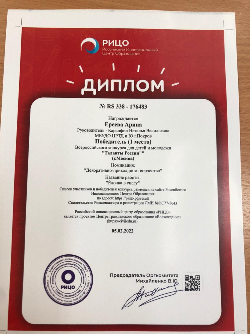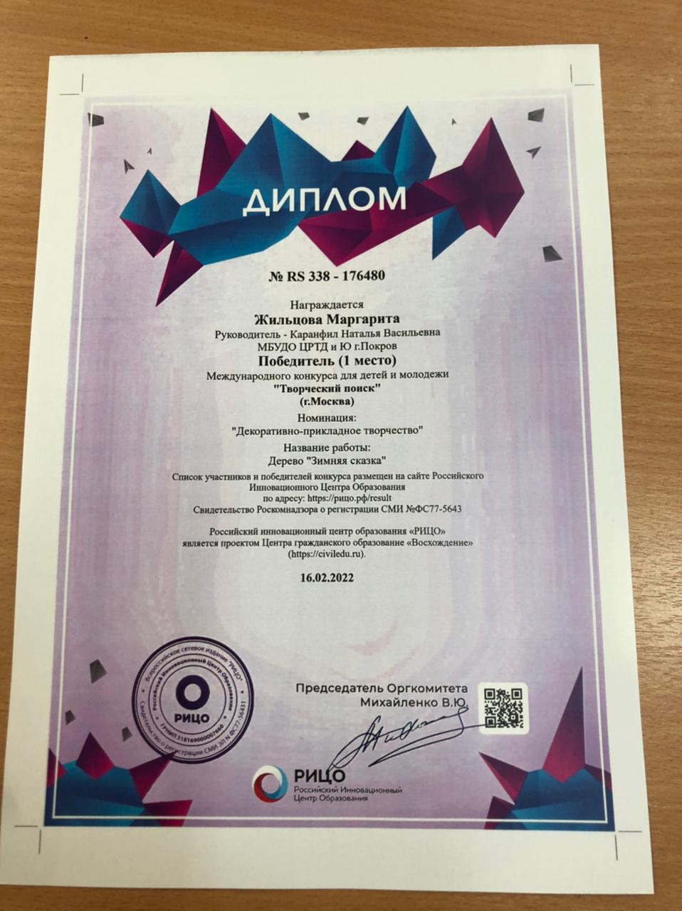 Девочки студии «Бисероплетение» принимали участие в Международном конкурсе «Творческий поиск», где Жильцова Маргарита заняла 1 место за работу Дерево «Зимняя сказка». А также во Всероссийском конкурсе «Таланты России» Ереева Арина заняла также 1 место за работу « Ёлочка в снегу». Девочки, поздравляем вас!