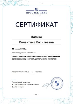29 марта 2022 года руководитель изостудии "Радуга" Валова Валентина Васильевна принимала участие в вебинаре, организованном издательством Академия "Просвещение" г. Москва. Тема вебинара: "Проектная деятельность в школе. Пути реализации организации проектной деятельности учителем".