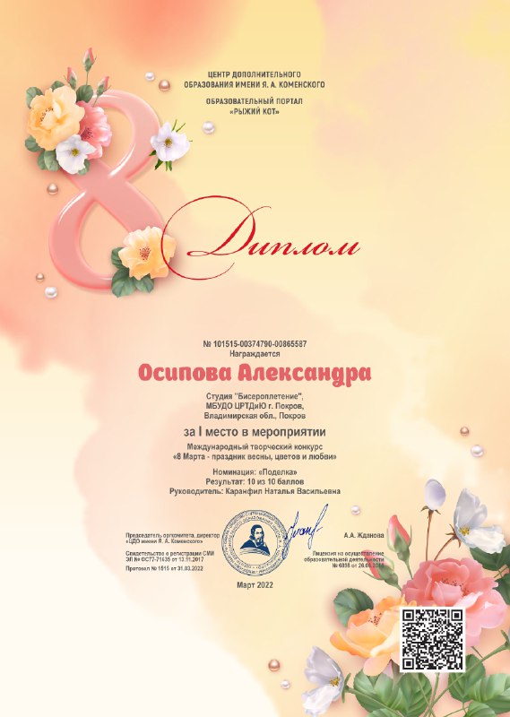 В весенние дни марта девочки из студии «Бисероплетение» ( Руководитель Каранфил Н. В.) принимали участие в Международном конкурсе «8 марта-праздник весны, цветов и любви» г. Самара на Образовательном портале «Рыжий кот». За свою творческую работу «Цветы для мамы» Осипова Александра завоевала диплом первой степени. Поздравляем, молодец Саша!