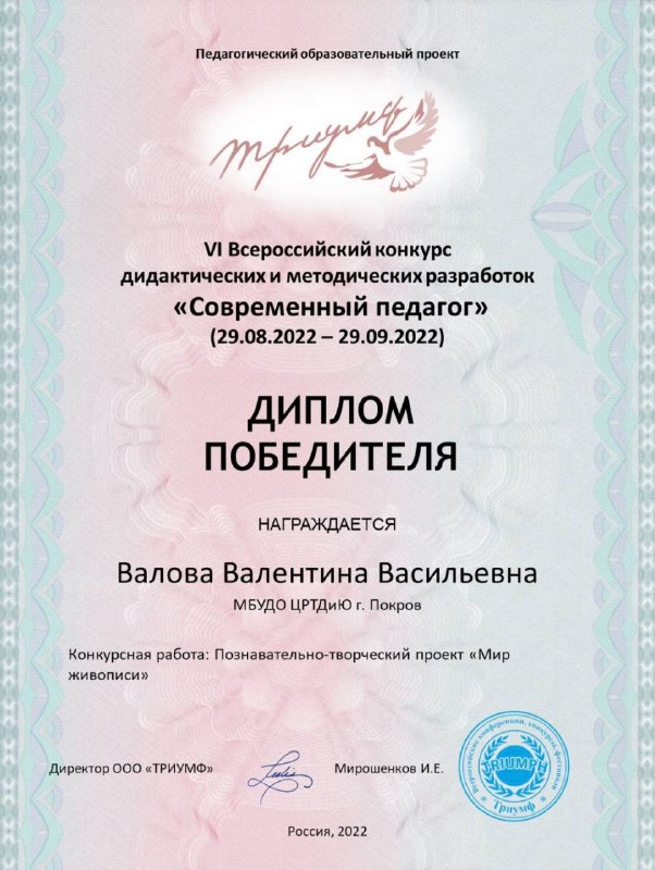 Поздравляем руководителя изостудии "Радуга" Валову Валентину Васильевну за победу в Vl Всероссийском конкурсе дидактических и методических разработок "Современный педагог"!