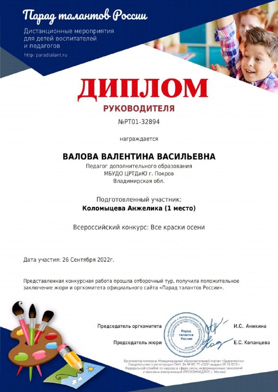 26 сентября 2022 г Коломыцева Анжелика - обучающаяся изостудии "Радуга" (руководитель Валова Валентина Васильевна) принимала участие во Всероссийском конкурсе "Все краски осени"
