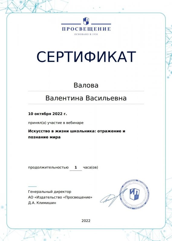 10 октября 2022 года руководитель изостудии "Радуга" Валова Валентина Васильевна принимала участие в вебинаре, организованном издательством Академия "Просвещение" г. Москва. Тема вебинара: "Искусство в жизни школьника: отражение и познание мира".