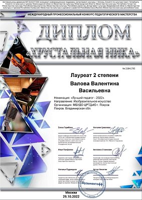 В октябре 2022 года руководитель изостудии "Радуга" Валова Валентина Васильевна принимала участие в Международном профессиональном конкурсе педагогического мастерства "Хрустальная Ника" г. Москва, Фестивальное движение "Музыкантофф". На конкурс были представлены лучшие работы обучающихся изостудии "Радуга".