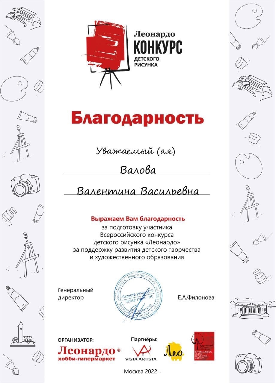 В ноябре 2022 года Бугрова Варя, обучающаяся изостудии "Радуга" (руководитель Валова Валентина Васильевна) принимала участие во Всероссийском конкурсе детского рисунка "Леонардо". Тема конкурса "Мой любимый город".