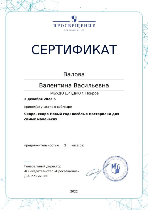 5 декабря 2022 года руководитель изостудии "Радуга" Валова Валентина Васильевна принимала участие в вебинаре, организованном издательством Академия "Просвещение" г. Москва. Тема вебинара: "Скоро, скоро Новый год: весёлые мастерилки для самых маленьких".