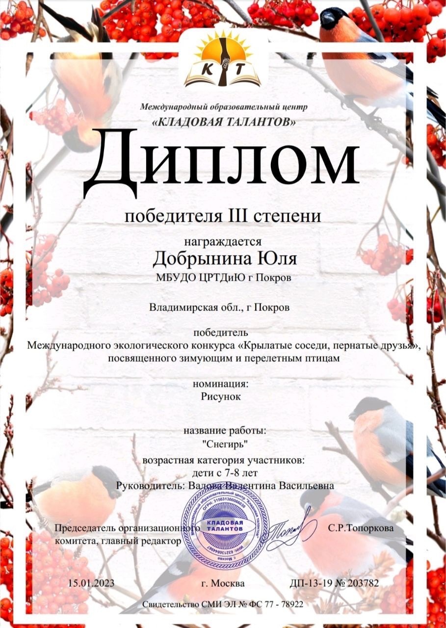 Поздравляем Добрынину Юлю, обучающуюся изостудии "Радуга" (руководитель Валова Валентина Васильевна) с победой в Международном экологическом конкурсе "Крылатые соседи, пернатые друзья" , посвященного зимующим и перелетным птицам.