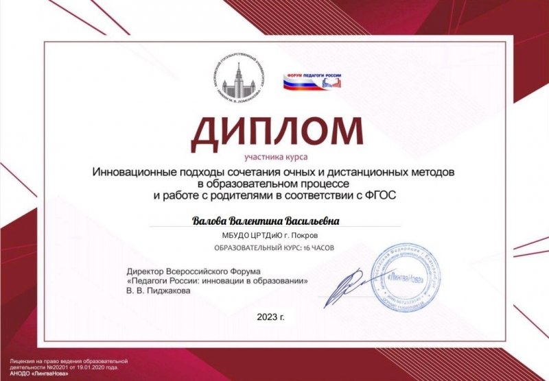 В феврале 2023 года руководитель изостудии "Радуга" Валова Валентина Васильевна принимала участие в Международном форуме "Наставничество в педагогике. Актуальные компетенции педагога в современном мире", проходившем на платформе Всероссийского форума "Педагоги России". В рамках ФОРУМА Валентина Васильевна освоила образовательный курс "Инновационные подходы сочетания очных и дистанционных методов в образовательном процессе и работе с родителями в соответствии с ФГОС" 16 часов. Организатор: АНОДО "ЛингваНова" г. Екатеринбург.