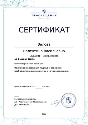Руководитель изостудии "Радуга" Валова Валентина Васильевна принимала участие в вебинаре, организованном издательством Академия "Просвещение" г. Москва. Тема вебинара: "Полихудожественный подход к освоению изобразительного искусства в начальной школе".